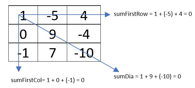 For this matrix, sumFirstRow= sumFirstCol=sumDia=0