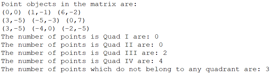 - Use the helper method (getQuadrant()) of the Point class to calculate and print the number of points in each of the four quadrants. You must also print the number of points which are not in any quadrant.