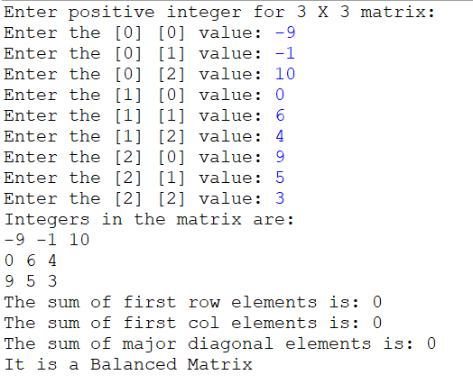 Write a Java program that reads a 3 X 3 array of integers (positive, negative or zeros) and calculates and prints if it is a balanced matrix or not.