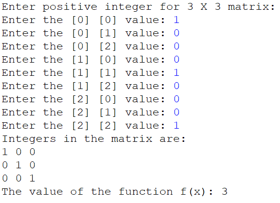 Write a program to read a 3 X 3 matrix of positive integers and computes the f(X) for this matrix.