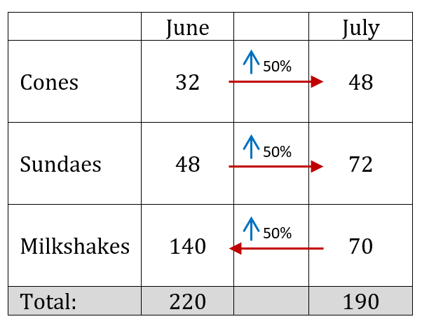 An ice-cream vendor sold 31 cones and 48 sundaes in the month of June. The sales of cones and sundaes increased by 50% each in the month of July. Additionally, the sale of milkshakes was 70 units in July which was 50% less than that in the month of June. What is the total percentage increase or decrease in the total sale of the vendor in the month of July?View Answer