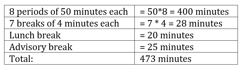 During a typical day in the school, each student attends 8 periods each having a total duration of 50 mins. There are 4-minutes between each period, which students utilize as a break. Additionally, every student has a 20-minute lunch break and a 25-minute advisory break. What is the total percentage of the time the student is having break time during the school hours?View Answer
