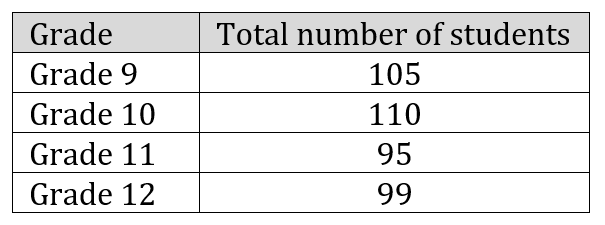 Also, total number of students in high school = 105 + 110 + 95 + 99 = 409