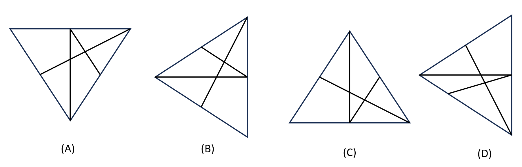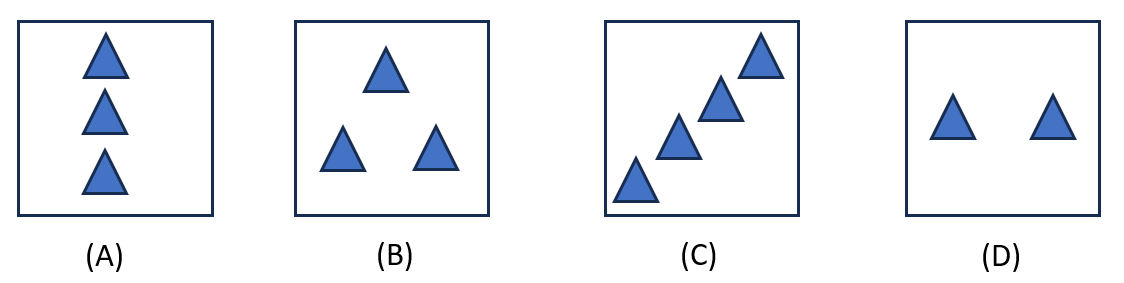 Explanation: In all figures, the triangles are arranged in a single line, except in figure (B), where they form a triangle.