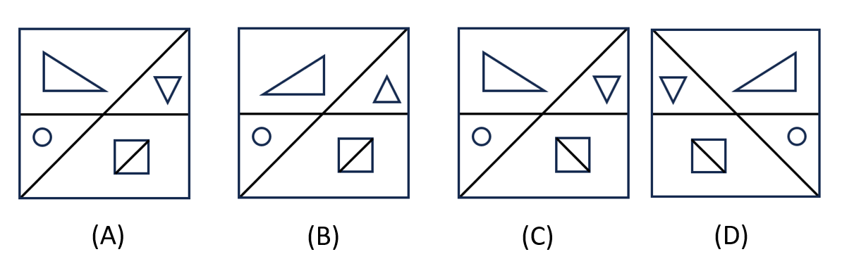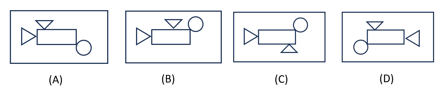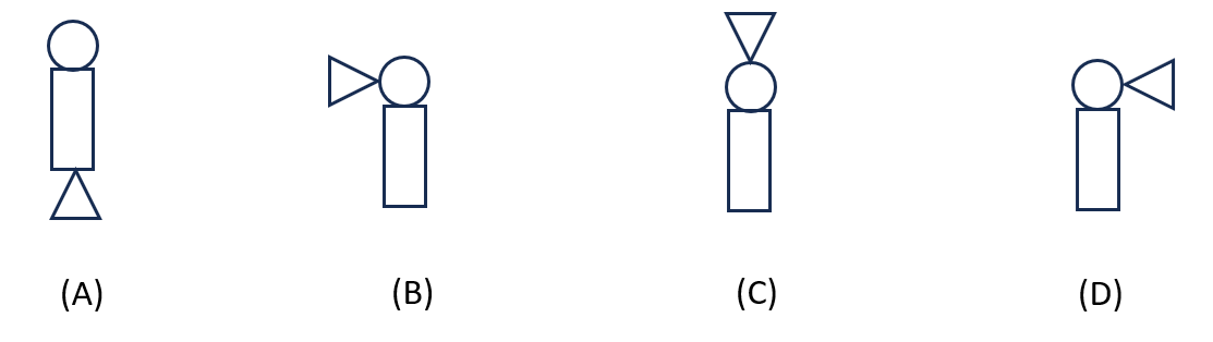 Explanation: In each of the figure, the circle shape is placed in the corner opposite to the two sides which are touched by the two triangles. However, in figure (B), the circle shape is placed on the corner along one of the sides which is being touched by a triangle.