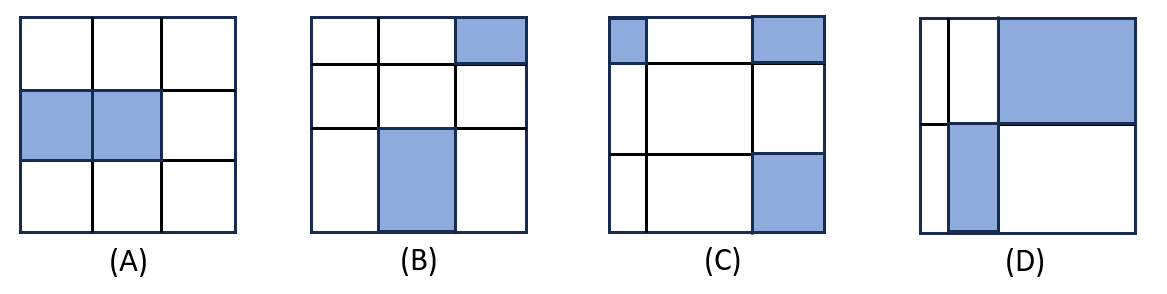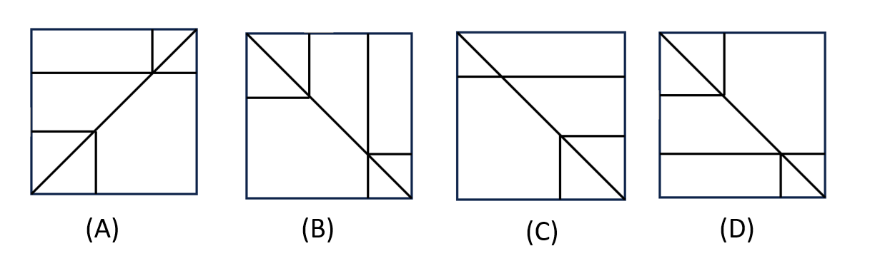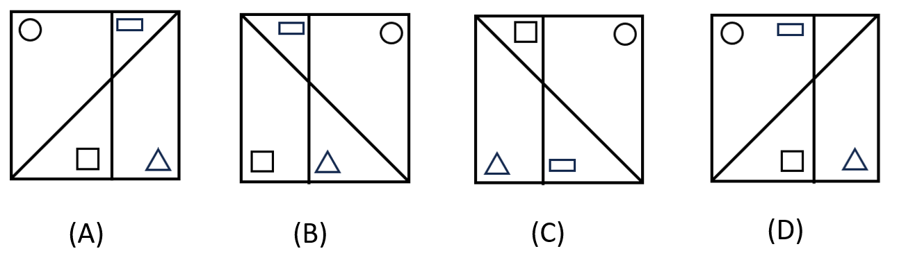 Explanation: In each of the other figure, each partition of the large square contains one single shape inside it. However, in figure (D), there are two shapes in a partition (circle and rectangle), while one partition has no shape.