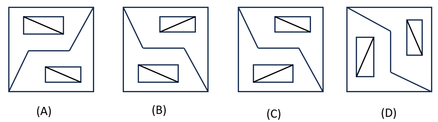 Explanation: In all the figures, except figure (A), the diagonals of the inner rectangles are in the same direction; whereas for all other figures, the diagonals in the inner rectangles are in opposite directions.