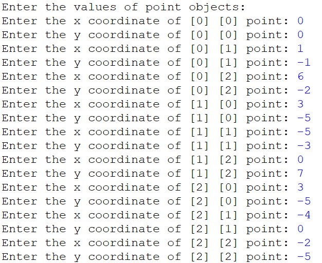 - Creates a 2D array of size 3X3 of point objects. [ You can either choose to take the point object coordinates as input from the user or initialise the array in the program itself]