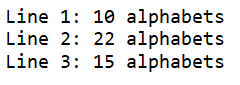 System.out.println(" Line " + lineNumber + ": " + count + " alphabets");