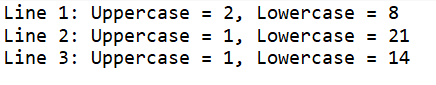 System.out.println("Line " + lineNumber + ": Uppercase = " + upper + ", Lowercase = " + lower);